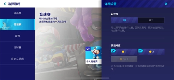 5、选择游戏模式时,可决定是否添加AI车手。单人游戏中,玩家与AI车手对战;团队游戏则是玩家组队与AI对抗。经体验,AI车手整体表现较为“笨拙”,出发后很快就会被远远甩开。