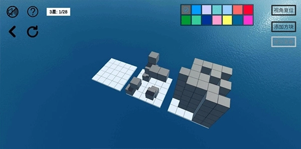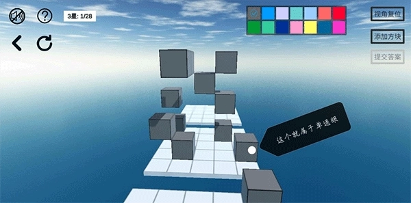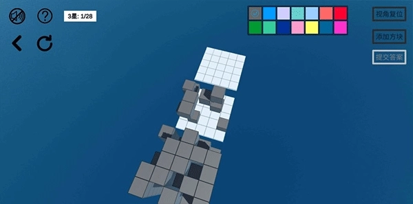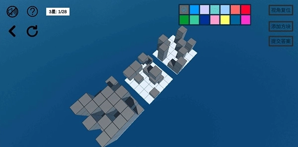 游戏技巧:根据中间棋盘给定的若干方块,以三个棋盘组成一个正方体为目标,将左右两侧棋盘补充完整即可过关哦。