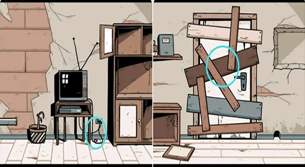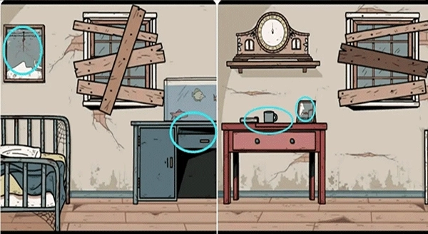 6、把两个卧室门打开展开搜索,于左边卧室的抽屉中找到胶水,先留意墙上的画,接着前往右边卧室,取走桌子上的黄色笔记本,最后查看第四幅图,依据之前图画的提示,打开取暖炉旁边的箱子,从而获取灯泡。