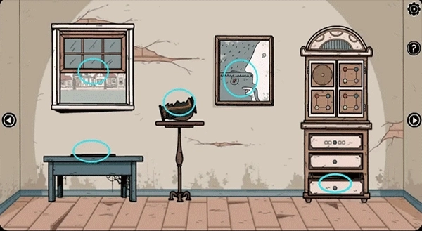 4、踏入白门之后的房间,首先从抽屉中取走棋子,然后留意墙上画里种子的生长状况以及手指的指向(其会出现变化,需依据实际情形判断),随后打开窗户,在左上角的树冠上寻觅到第一只猫头鹰。特别提示:此游戏中总共藏有九只猫头鹰,记得仔细寻找哟。