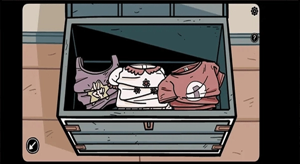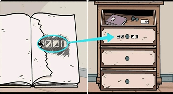 7、查看箱子内衣服上的图案(右边第1个、左边第2个、中间第3个)以及衣领上的标签(有三个符号),接着依照顺序排列这些符号,就能打开之前拿到的黄色笔记本。