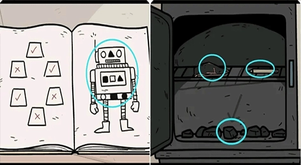 8、查看笔记本内的信息,依据机器人身上的提示(留意黑白位置,其会发生变动,需按照实际状况),打开右侧的取暖炉,获取花瓶碎片、铅笔以及煤炭。
