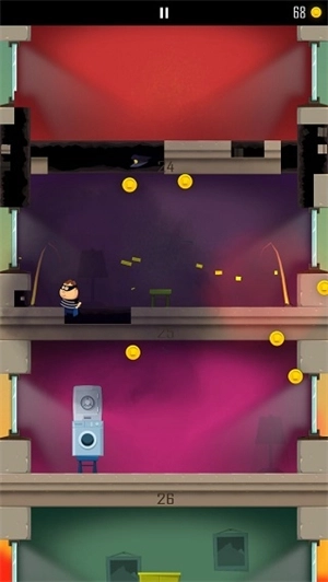 1、游戏开始会有一个小偷开始跑到另一层楼,玩家需要做的就是通过角色屁股着地的方式破开楼层,这样就能不断到达底下那一层了;