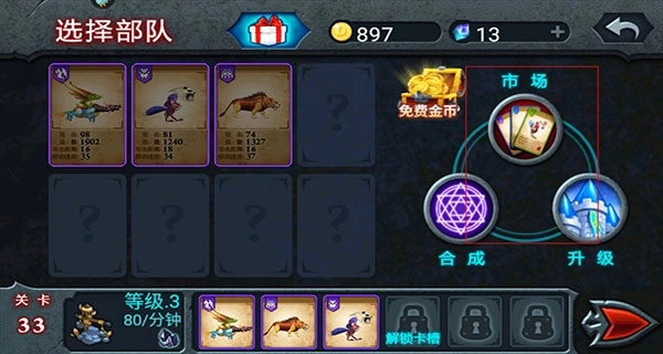3、在游戏界面的右上方,玩家能够看到市场、合成、升级等图标。
