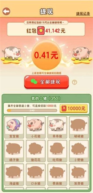 3、一键完成提取,模拟卖猪获得的收入能够在此随时申请提取