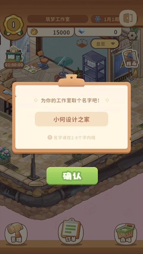 4、为你的工作室取一个名字,点击确认继续继续游戏。