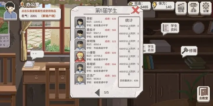 5、所有可以招入学的学生都是随机生成的。学生有性格和天赋,有些厌学的学生在课堂上更加容易捣乱。有些天赋高的学生能够额外获得知识。通过培养和学生的好感度,可以改善学生的一些毛病。
