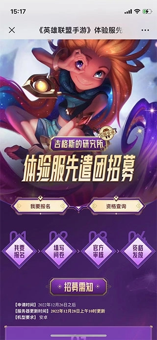 3、点击后进入LOL手游体验服申请界面,在这里点击【我要报名】选项,然后填写问卷提交,之后等待13号的时候查询资格即可。