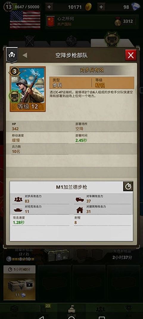 在空降流里,完善到最后的补牌环节至关重要,缺了它,空降流就始终不完整。士气高昂的英雄或许能舍弃,但空降步枪连队绝不能少。在勇猛之路二战这款游戏中,它堪称浑水摸鱼的高手。前面提到过,空降部队虽配备反坦克武器,可自身面板脆弱,四人编制虽有一定优势,却难以撼动任何精锐步兵。此时,就得依靠人多势众,再从空中降下两个六人组成的步枪连队,它们能迅速压场,击杀敌方精锐步兵,再配合空降部队自带的医疗兵,能将压场效果发挥到极致。而且防御塔行动较为迟缓,打死一人后,很容易将攻击目标转向其他步兵,这相当于变相为存活的空降部队提供保护,让空降部队有更多机会使用m1无后坐力炮,前面也说过,它还能为残血坦克吸收前排火力伤害。总之,在空降联队手中,它用途广泛,能玩出诸多花样。这是一支上限极高的部队,还有个小窍门,要是玩人海战术,可借助这支部队和空降部队营造出人造D - day,十分有趣。不过,如果步兵联队专注于建筑玩法,就无需使用这张牌。此外,这张牌能扛住防御塔的伤害,配合爆破工程兵扔出背包炸弹,在开局突袭时效果显著,堪称出其不意。