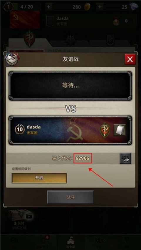2、在这里可以输入好友分享给你的入场码,点击入场就可以了,也可以点击【开友谊战】来自己建立房间。