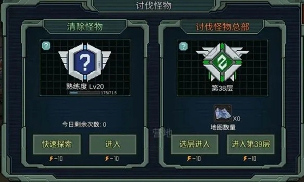 4、清除怪物及怪物总部。清除怪物这张地图怪物分布密集,每天能进入三次,建议使用双倍卡进入,这样获取的经验较多。怪物总部地图可在清除怪物地图中获得,每天能得到三张,要是打不过可以先留存。升级装置能够增强在怪物总部的属性抗性等。这张地图相当重要,后期难度会随之提升,但到那时新手也已成长为老手,想必能够应对。