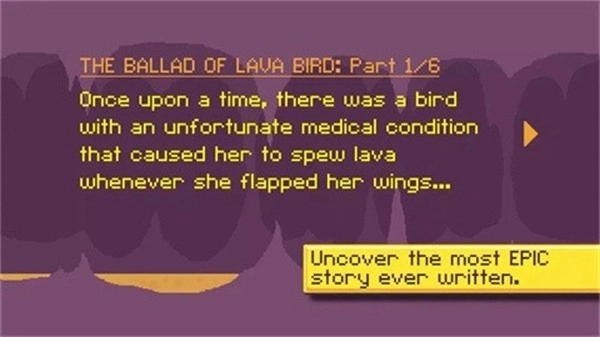 4、在游戏里,玩家只要击败小鸟,便会触发故事。很久很久以前,存在着一只鸟,它的身体状态欠佳,每次扇动翅膀都会喷出熔岩。