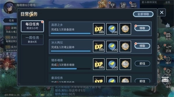 每日奖励包括高原之乡,冰火两仪,猎杀魂兽,日常周常奖励等等。
