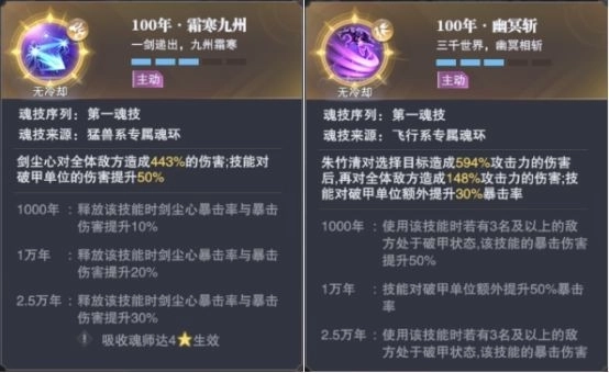 而剑尘心的第一魂技霜寒九州可以对破甲的单位造成额外伤害,那么这两个技能必然是可以搭配在一起用的,同理朱竹清的第一魂技幽冥斩也是可以对破甲的单位造成额外伤害
