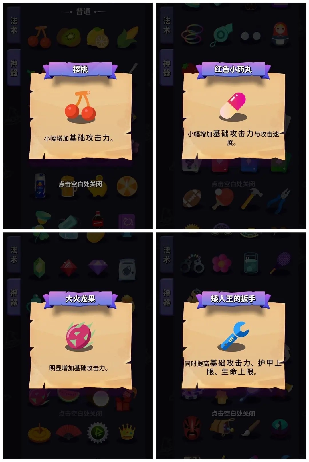 这四样分别是白 蓝 紫 金四种级别的增幅攻击力的道具,其中