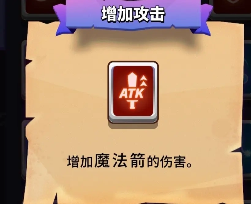 另外三个法术卡相较于前两个,实用性更强,它们能直接改变我们的弹道形式。 先来说说散射,当单独持有散射法术卡时,弹道会分叉为三个;若拥有2级弹射,弹道则会分叉成五个。我测试出副弹道的伤害为50点,但副弹道伤害有可能等同于攻击力,也有可能是固定的50点伤害。由于数据不够充分,暂时无法给出确切结论(尴尬)。 接着是二连射和正向箭,这两张法术卡较为相似,都用于改变主弹道(即直接射向距离你最近怪物的那发子弹)的形式。而且单独持有这两张卡时,都会额外增加一个小子弹。二连射是在子弹后方增加一个小子弹,正向箭则是在子弹左边增加。小子弹的伤害固定为27点,且不可暴击。例如开局拿到一张二连射,攻击敌人时造成77点伤害,若暴击则是100点,其中27点伤害应该是被100点覆盖了。如图所示。