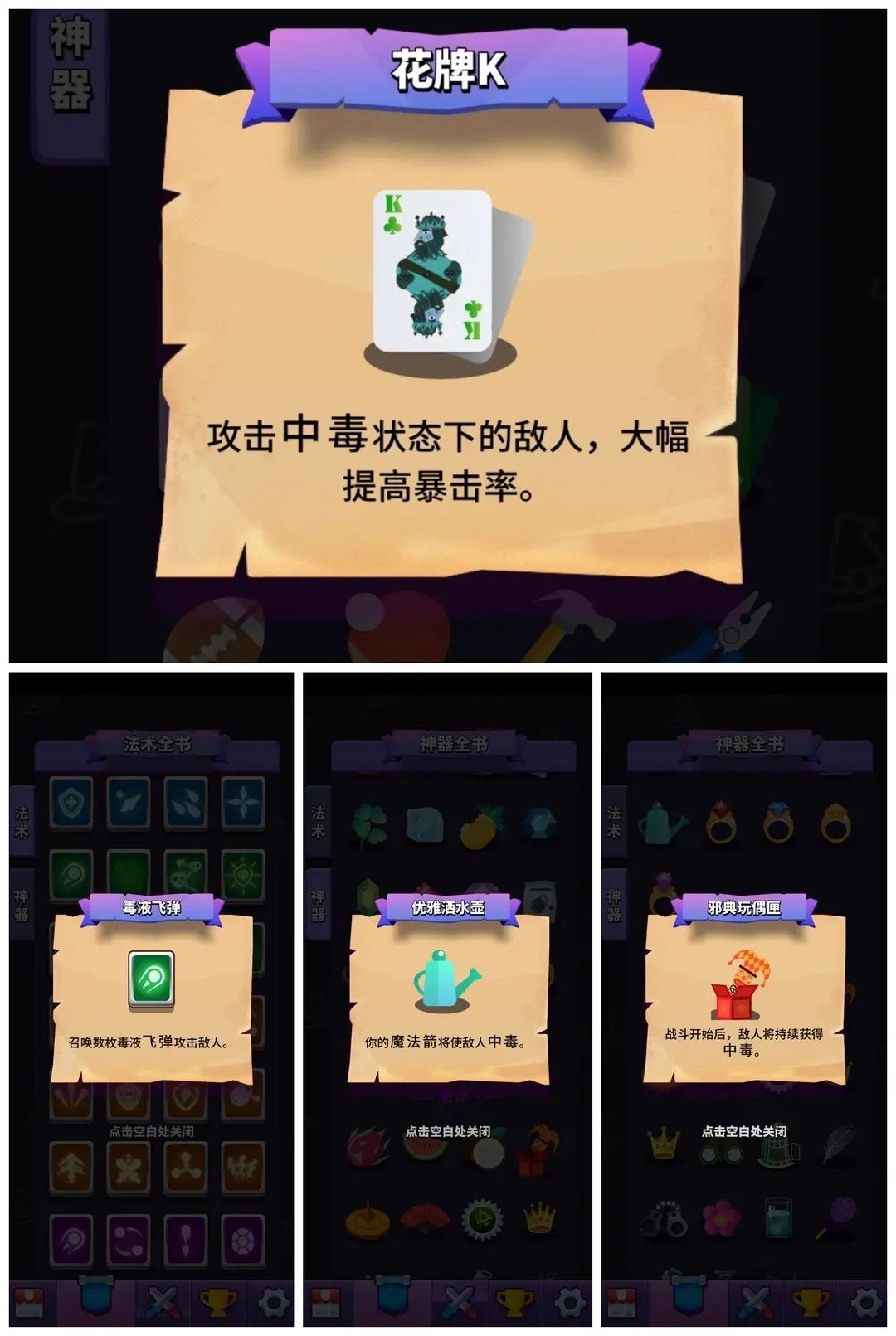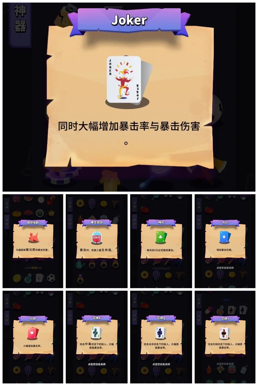 首先,暴击率法术卡,像红牌、蓝牌、千纸鹤这类,都是非常实在地提升我们暴击率与暴击伤害的,遇到了就该拿。joker更是平A流里绝对的关键角色,是不可或缺的存在。不过,此时我们距离满暴击或许还差点,这就需要花牌来助力了。在三种花牌中,我建议选择毒花牌来提高暴击率,原因是冰冻状态不太容易触发,而且持续时间太短,烧伤情况也一样,所以冰火花牌可以排除掉。至于能给敌人上毒的道具,我推荐下面这几个:
