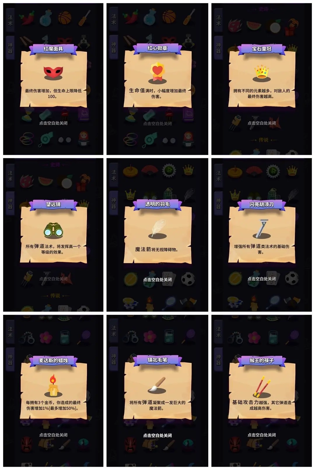 刮胡刀跟金箍棒相似,都能增幅弹道类法术伤害,像小子弹、副弹道这类。镇北毛笔能把其他所有弹道凝聚成一颗子弹,单体伤害大幅提升,但清怪能力有所降低。金箍棒还能在很大程度上增强毛笔的伤害。这里顺便填个之前的坑,我一开始讲攻击力时说不选扳手,主要原因是扳手属于金色神器,而一场游戏里我们最多只能拿3个金色神器,所以选择时得慎重考虑。对于平A流而言,joker、蜡烛、毛笔、金箍棒,甚至筹码,都是比扳手更好的选择,因此扳手就不列为首选了。而且我发现有些玩平A流的小伙伴,在金色神器里还会选脸谱和斧头。我觉得这其实没必要,脸谱乍看挺厉害,可我们有了望远镜,就没必要拿脸谱了。至于斧头,主要是我们对紫色神器需求不高,很容易拿齐,到后期能选的基本是环绕物之类的神器,所以平A流在精英关拿两个斧头,也不算特别离谱的增强。