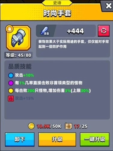 手套:带时尚手套,1%秒杀精英怪这个属性总会给你惊喜,金时尚手套,5分钟左右就能击败2000只怪物,增加我们30%的伤害,这个属性确实猛。