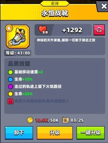鞋子方面,若有S鞋,优先使用S鞋,在前期,S鞋的火焰路径所造成的伤害,几乎等同于一把武器。要是没有S鞋,那就选择能量鞋。能量跑鞋不仅能稳定提供减伤与输出加成,而且在击败敌人后,还会刷新3秒的效果,也就是说,只要持续击杀小怪,就能不断提升输出。相比之下,能量鞋比军用鞋略胜一筹。军用鞋只有在激励状态且不受击的情况下,才会有属性加成,一旦受到攻击,属性加成便完全消失,不过10%的生命加成依旧存在。