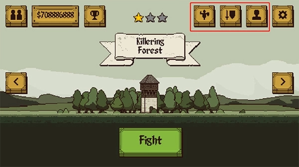 2、点击中间的“Fight”,就能开启游戏。页面上方从左至右依次是训练场、武器和人物。