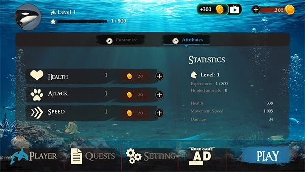 1、消耗金币能够增添属性点,还能查看虎鲸的详尽数据,点击“play”即可开启游玩。