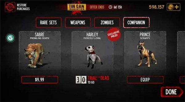 4、伙伴购买,这是一个比较有意思的系统;每隔一段时间会有一个你的宠物伙伴帮你干掉前面的僵尸,可以出现多个伙伴;包括有老虎、狼和狗等。