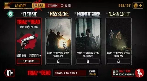 5、解锁游戏模式,游戏包括传统模式、大屠杀模式、极端模式和闪光灯模式;除了传统模式外,其他模式都需要通过完成任务来解锁。