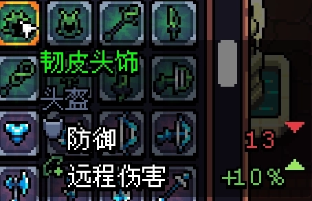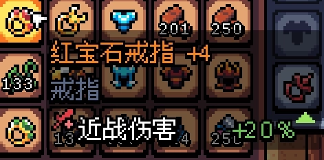 沙漠也有一个地洞,算是一个小挑战,boss弹幕多伤害也较高,但血量低,沙漠清完后应该有+3的红宝石戒指了(如下图,我的+3被我扔了,用+4装一下)顺便吐槽一下箱子空间有限装备还不能卖,多余的只能扔了,收藏党震怒,建议徽章伤害拉满镰刀速秒碎片boss法老王