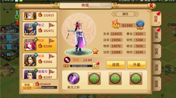 答 在包裹界面的下方有合成功能,一定数量的将领魂石可以合成对应将领资质书对将领资质进行洗炼。