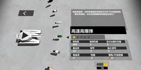 如它的名字所示,他是一个高爆弹,这代表了他有可能对地方造成暴击,但是与其他高爆弹兄弟不同的是,他的速度更快,而且是越来越快,因为炮弹自身具有动力。该炮弹属于中规中矩的级别,比起强度更看重玩家习惯,因为会不断加速,这对玩家的预判要求也不同,有些玩家用的习惯,有些玩家用不习惯,这都是因为他的速度。不过我个人还是很推荐各位去试试这个炮弹的,根据个人手感决定要不要拉满这个炮弹。