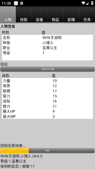 3、开始一个新游戏时,会显示几个选项供玩家选择,让玩家决定他的角色的种族及职业。而初始状态则是透过模拟掷骰子决定,包含力量、体质、敏捷、智力、智慧及魅力六项能力值。玩家们以低于水平的装备开始游戏,慢慢地赚取更好的武器、装甲、及咒语。