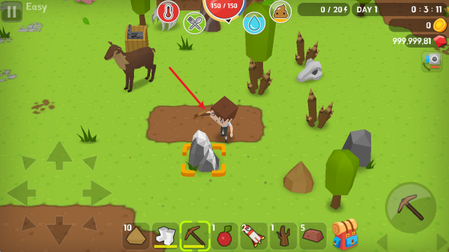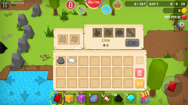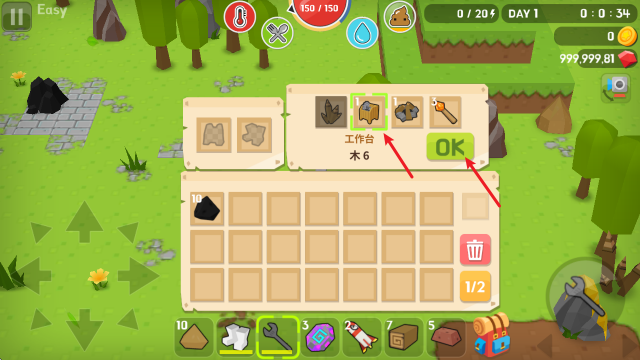 采集到资源后,我们可以打开背包制作一些简易工具,而第一步就是要建造工作台。