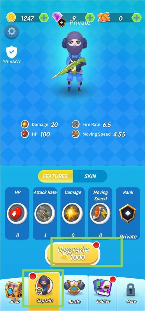 3、Captain界面可以进行角色的升级,点击Upgrade进行升级。