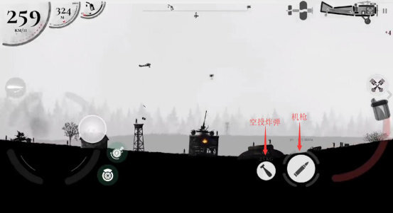 4、加油完成后按照起飞教程重新起飞,途中会遇到敌人,可以使用右下角的空投炸弹和机枪进行攻击。新手教程只需使用空投,空投炸弹要注意打提前量,不然很容易就MISS。