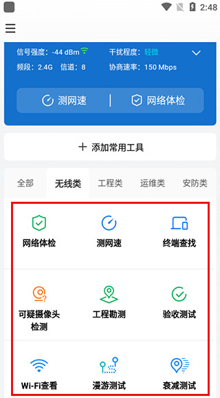 无线类小工具包含:网络体检、测网速、终端查找、摄像头检测、Wi-Fi查看、漫游测试等功能。