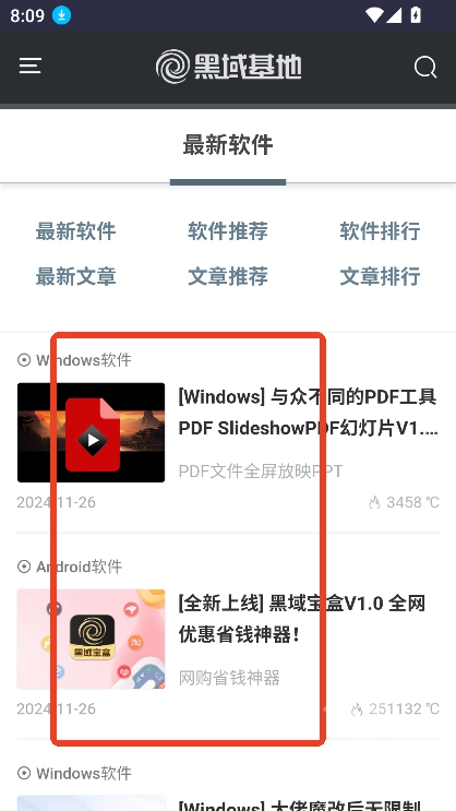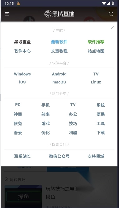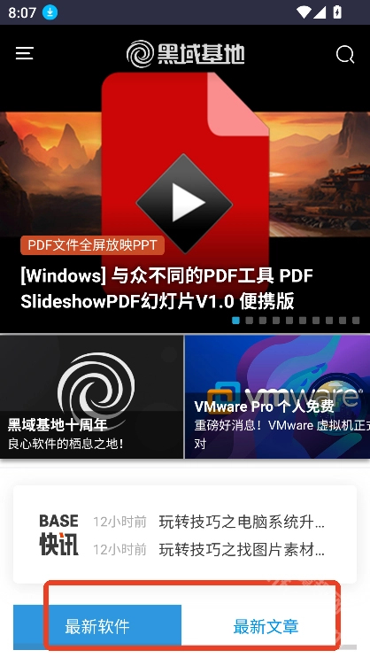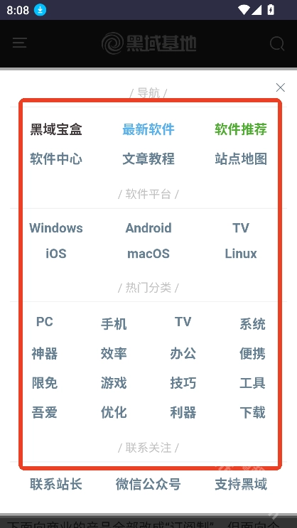 在魔趣网(m.mfunz.com)下载并安装黑域基地手机版。进入首页后,能看到最新软件和最新文章这两个板块。