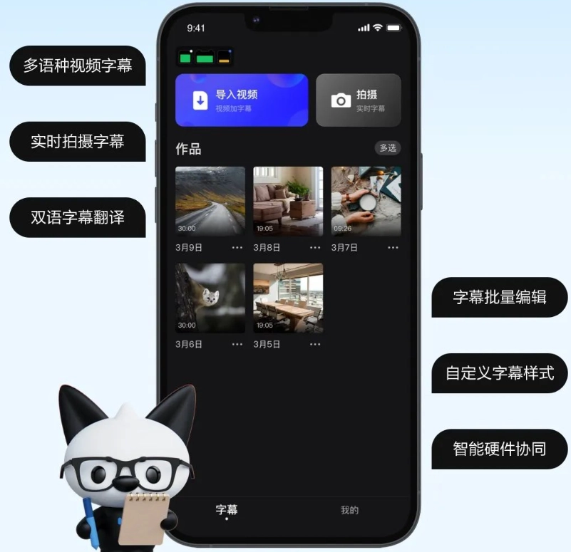 讯飞听见字幕是一款支持手机字幕批量编辑和识别的视频生成和转写软件,可以利用讯飞听见字幕来导出视频或者翻译、去掉文字等,可以一键导入,中英日韩及繁体字幕可以快速生成,生成后也支持一键保持到手机相册或者分享给亲朋好友。