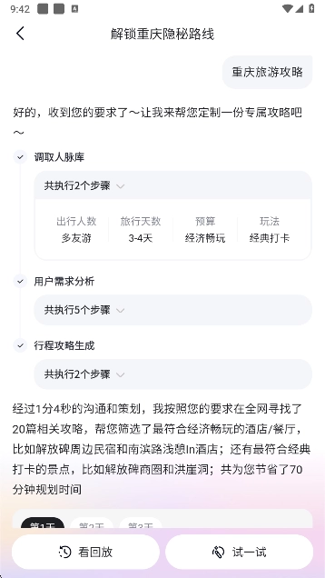 沉浸式行程规划服务:用户仅需输入一句需求,系统即可生成完整的旅行攻略,同时能联动动态地图直观呈现路线,数字人导游还会引导用户选定行程天数、预算范围与游玩方式,进一步增强“身临其境”的决策体验。