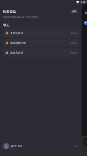 点击左上角的三条横线图标,就能打开菜单界面,在这里可以查看历史对话记录,还能进行账号切换等操作。
