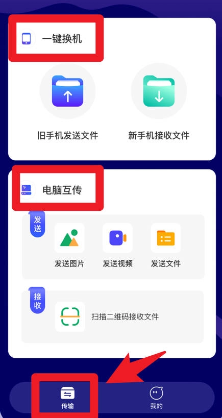 在传输页面,用户可选择一键换机或电脑互传功能,该功能支持旧手机发送文件、新手机接收文件,同时也能通过扫描二维码来实现文件的快速互传。