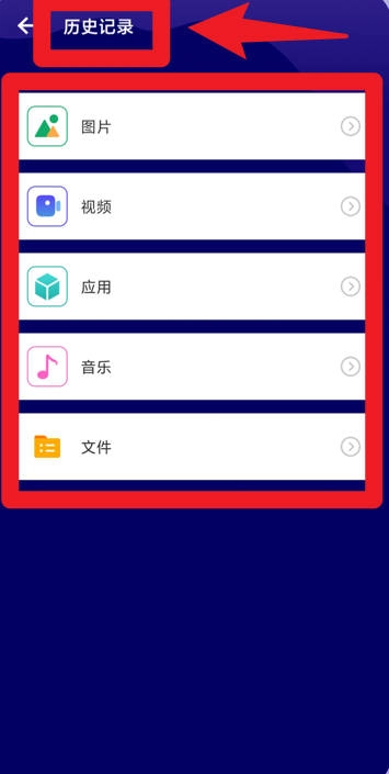 历史记录页面留存着所有传输过的文件类型,涵盖图片、视频、应用、音乐与文档,便于用户随时查阅传输详情并管理数据。