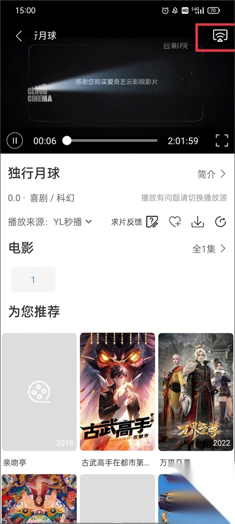 点击上方的视频播放区域后,右上角会弹出一个投屏图标按钮,点击该按钮即可。