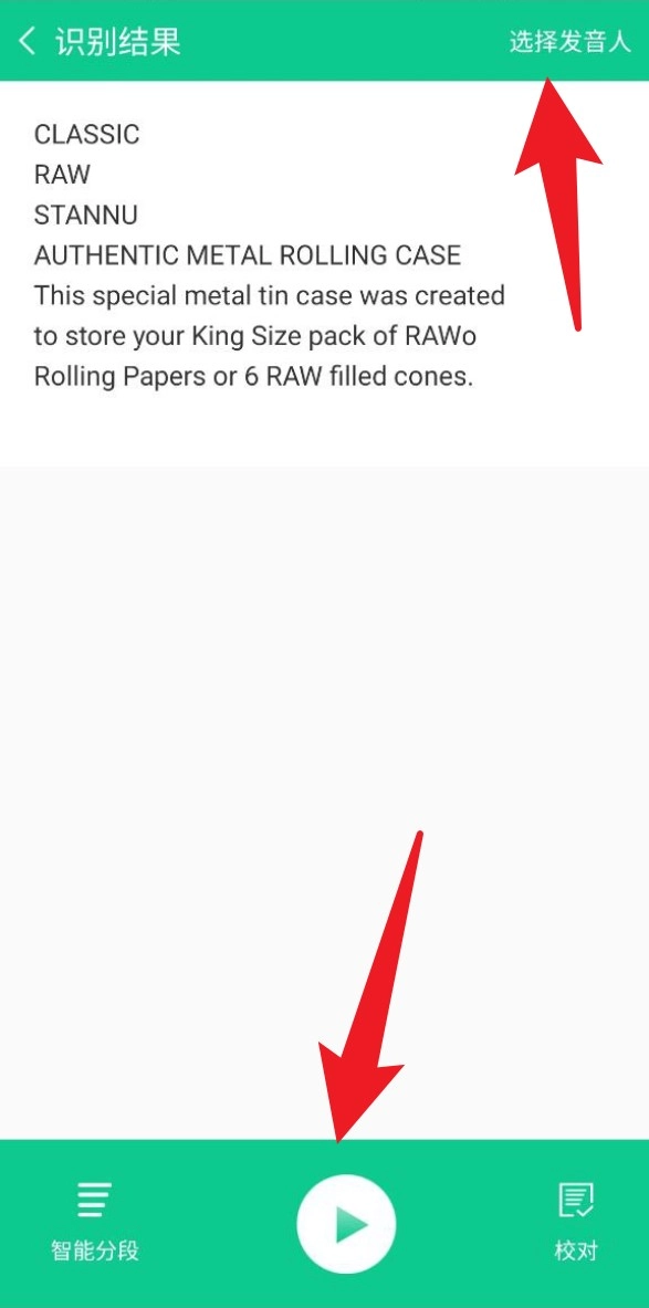拍照结束后会自动跳转到识别页面,在这里能查看提取出来的文字内容,点击底部的播放按钮就能启动语音朗读功能。