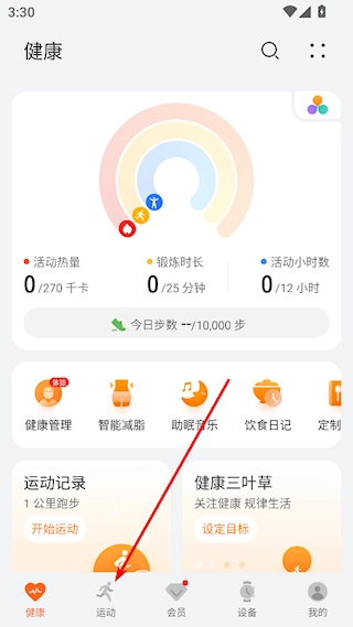 打开华为运动健康,点击底部的运动