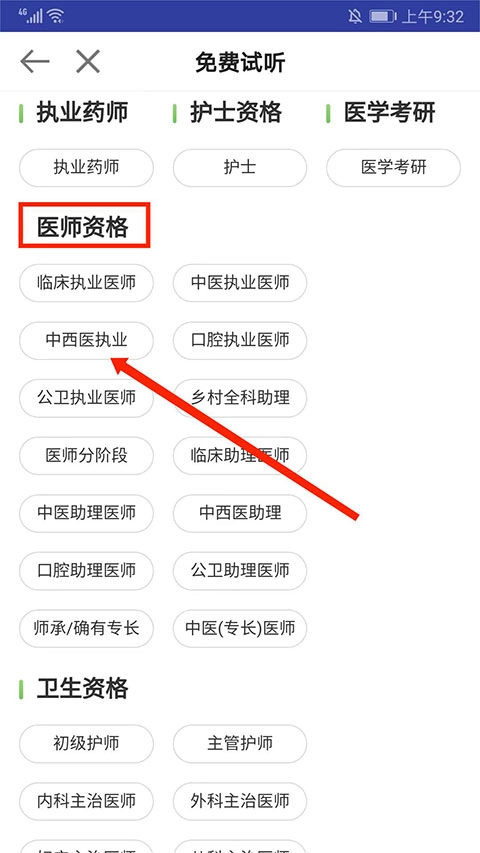选择所需的视频类型,此处以“医生资格”类别下的“中西医执业”选项作为示例。