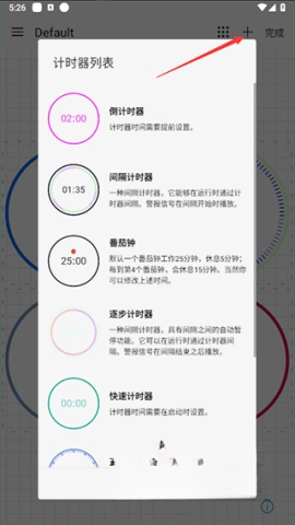 添加计时器的操作步骤如下:点击界面上的“+”号按钮,接着在弹出的选项中挑选你需要添加的计时器类型。