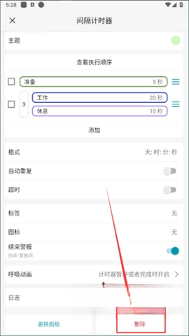 方式二:长按计时器,进入设置界面后滑动至底部,选择删除选项即可。