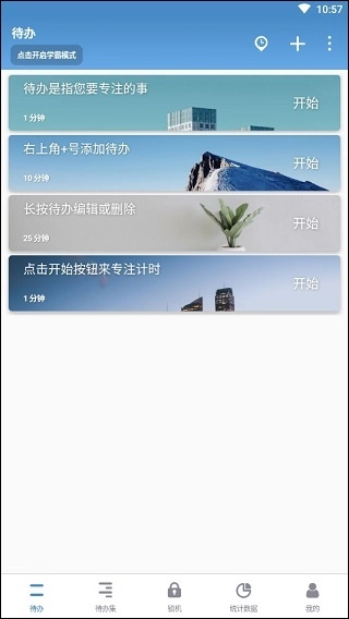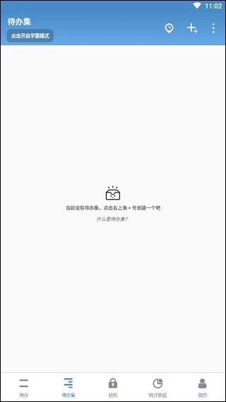 点击界面下方的待办集即可切换至“待办集”界面,用户可以在这里创建新的待办集,用于添加所有未完成事项的计时。此外,待办集的删除操作同样是通过长按来完成的。