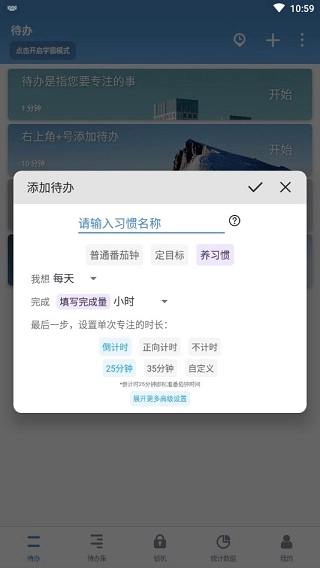 番茄钟与习惯养成功能相结合,能够设定每日、每周、每月的专注时长目标,并且融入了10000小时理论,从而让专注变得更加高效。